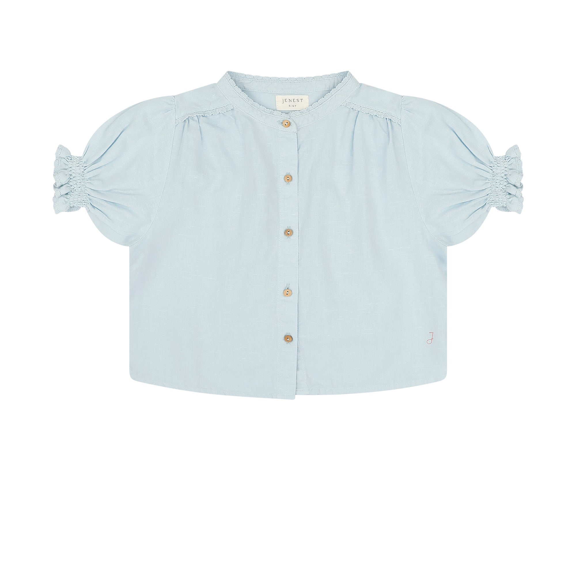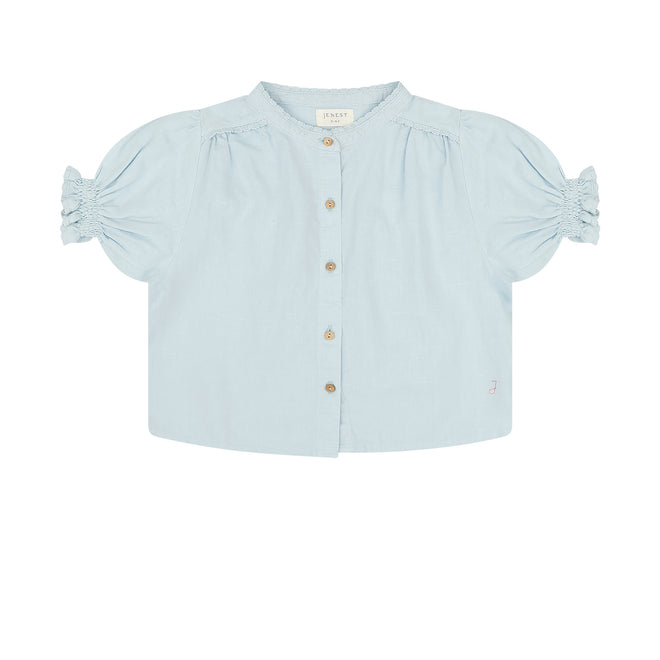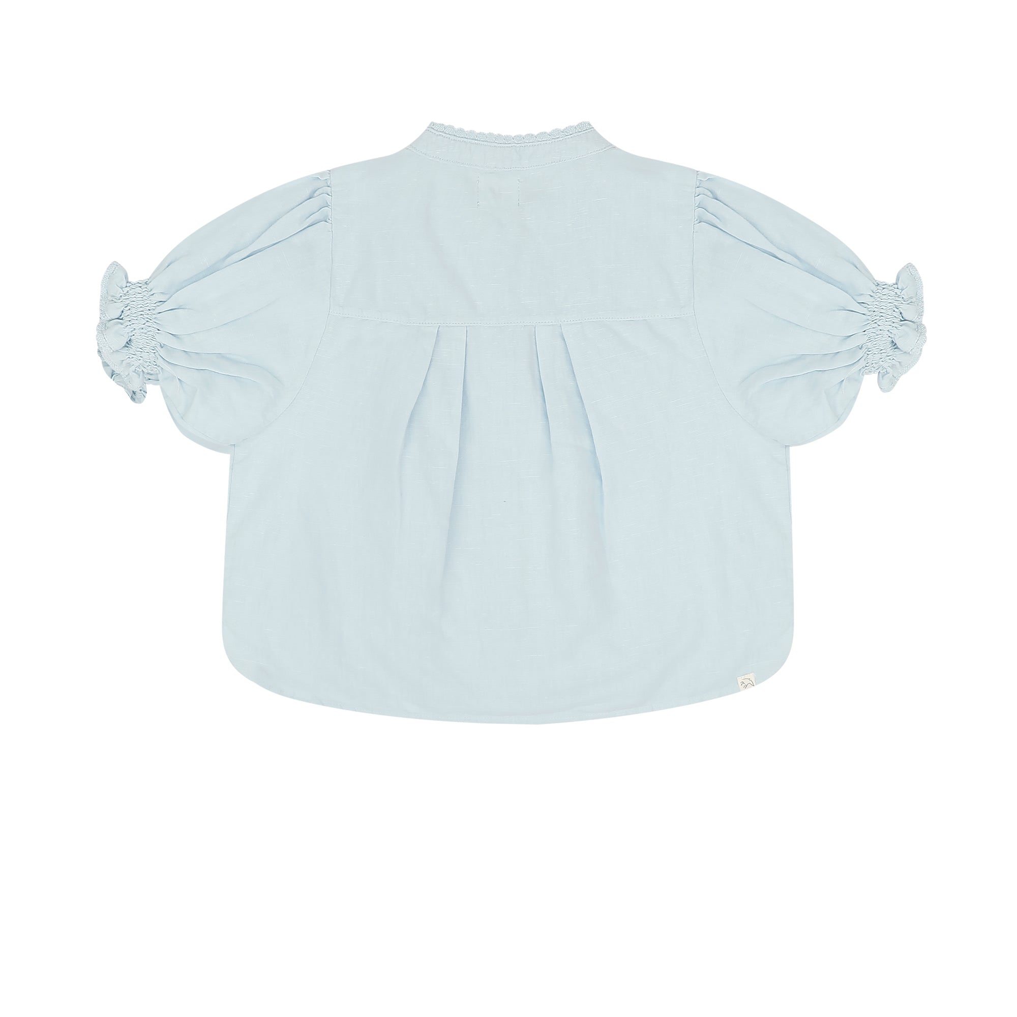 This short sleeve blouse with a loose fit has broderie details at collar, shoulder and sleeve ending and is made of organic cotton linen.