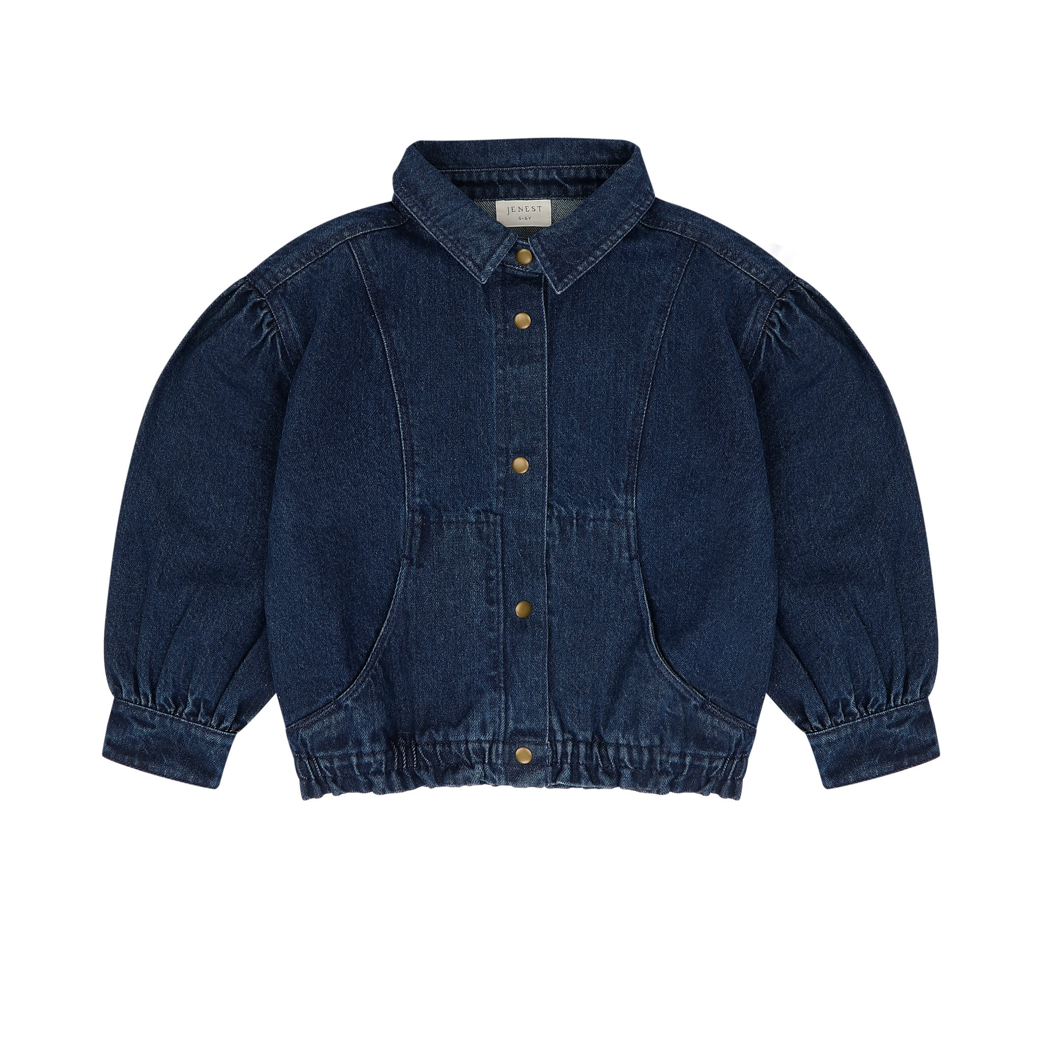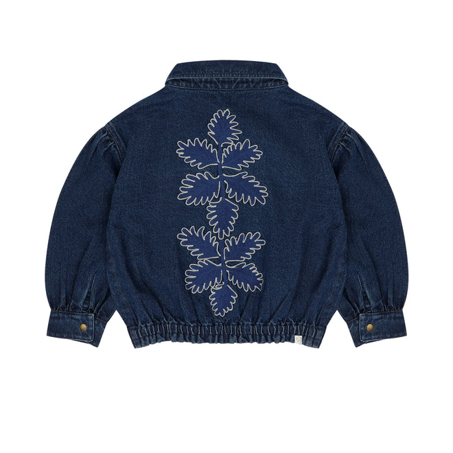 This oversized denim jacket has a big flower embroidery at back back , elasticated hem , snap closure at front, the insert pocket at front panel - Denim oversized jacket, Snaps at closure Big flower embroidery at back panel Elasticated hem Front pockets 100% Sustanaible cotton Dark Wash