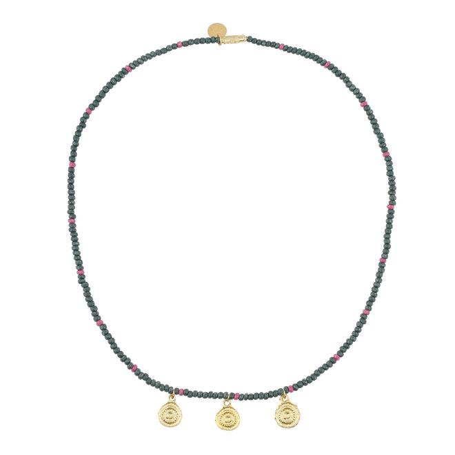 Product description This necklace made of 2 colour beats has three coins at front and closure at backside of necklace - 2 colour beats Coins Closure at back Not Suitable under the age of 3